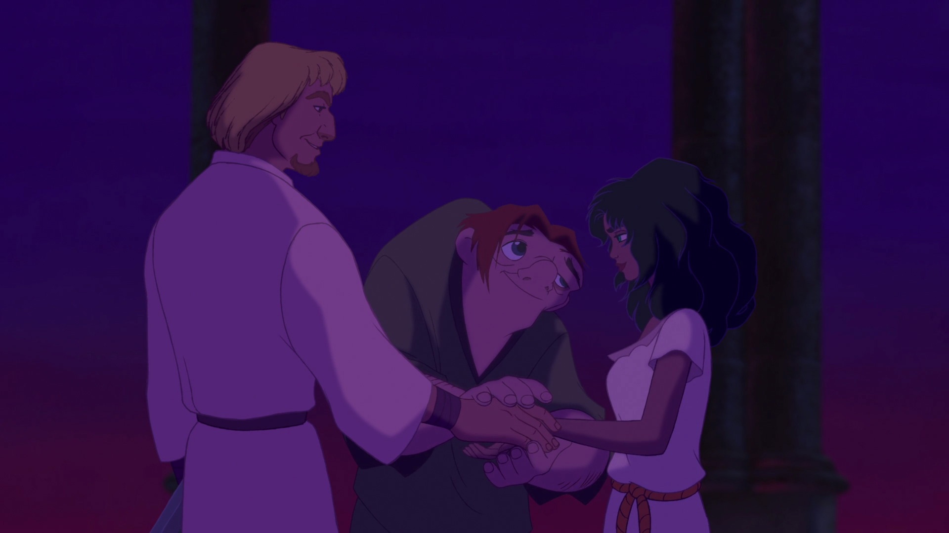 Esmeralda reuniting with Phoebus and Quasimodo, after Frollo's demise.