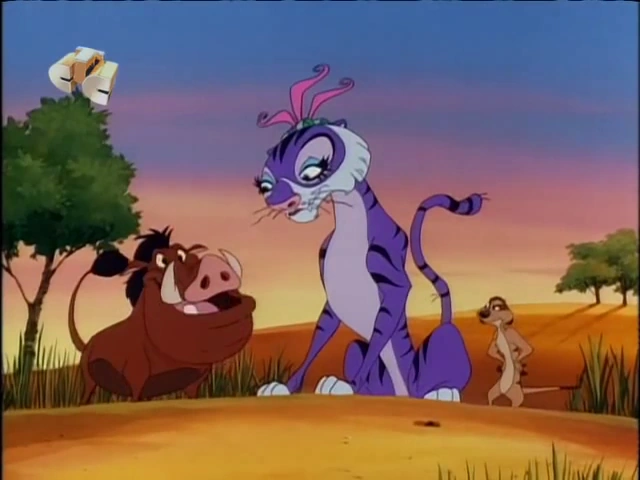 While Timon and Pumbaa are sleeping under a rock formation, the tigress sees them and stalks them, but then she sneezes, which wakes up Timon and Pumbaa, leading the two to run away from her. Pumbaa then finds it strange how the tigress is not chasing them, so he decides to stop. When the tigress sneezes, he gives her a leaf for her to use as a tissue.